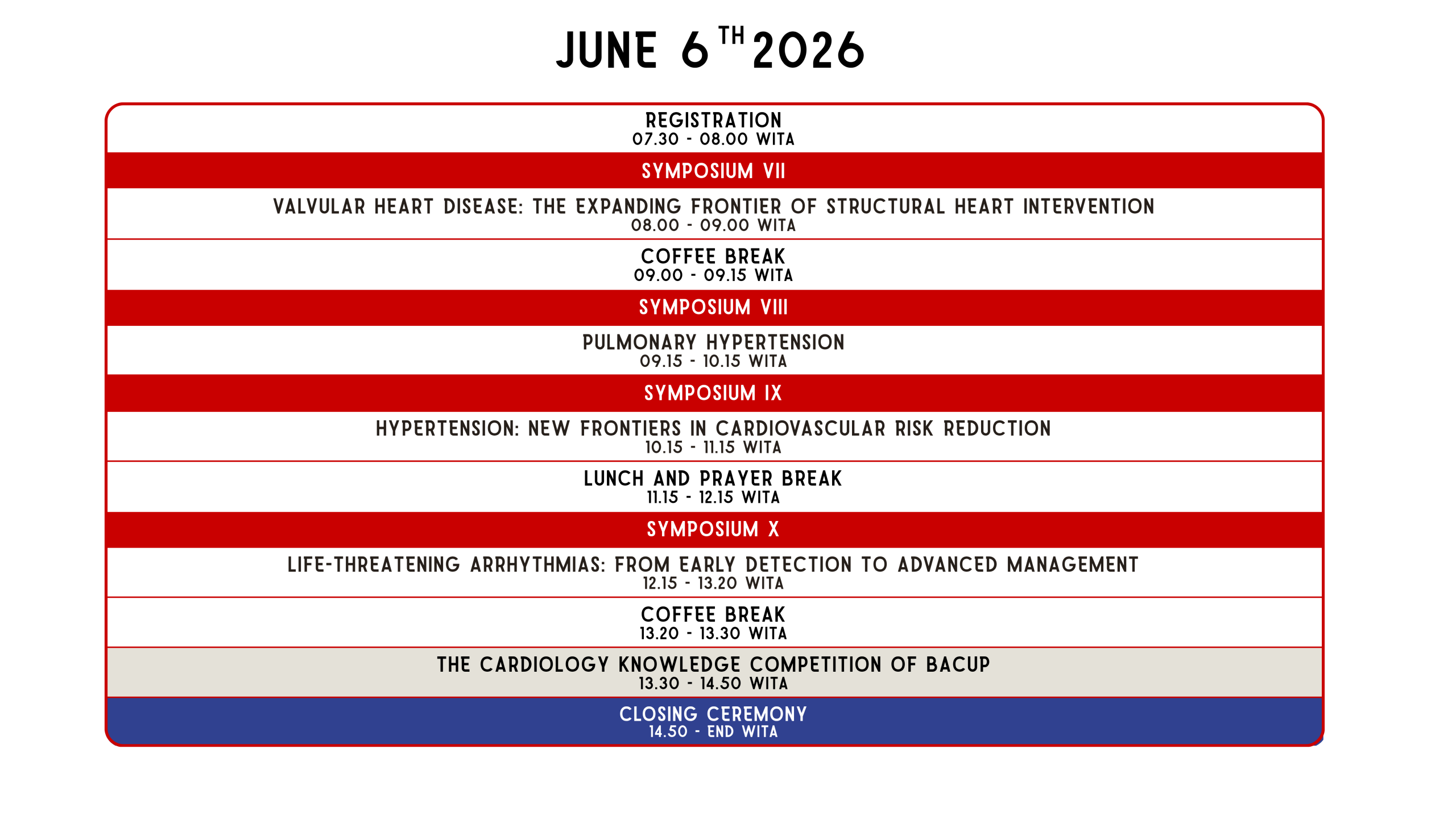 Our comprehensive program is meticulously designed to bridge the gap between foundational knowledge and the latest breakthroughs in cardiovascular medicine through 9 Intensive Workshops and 10 Specialized Symposia. There will be also another round of GP Competition: A high-energy platform for General Practitioners to showcase clinical excellence and compete for top honors.
